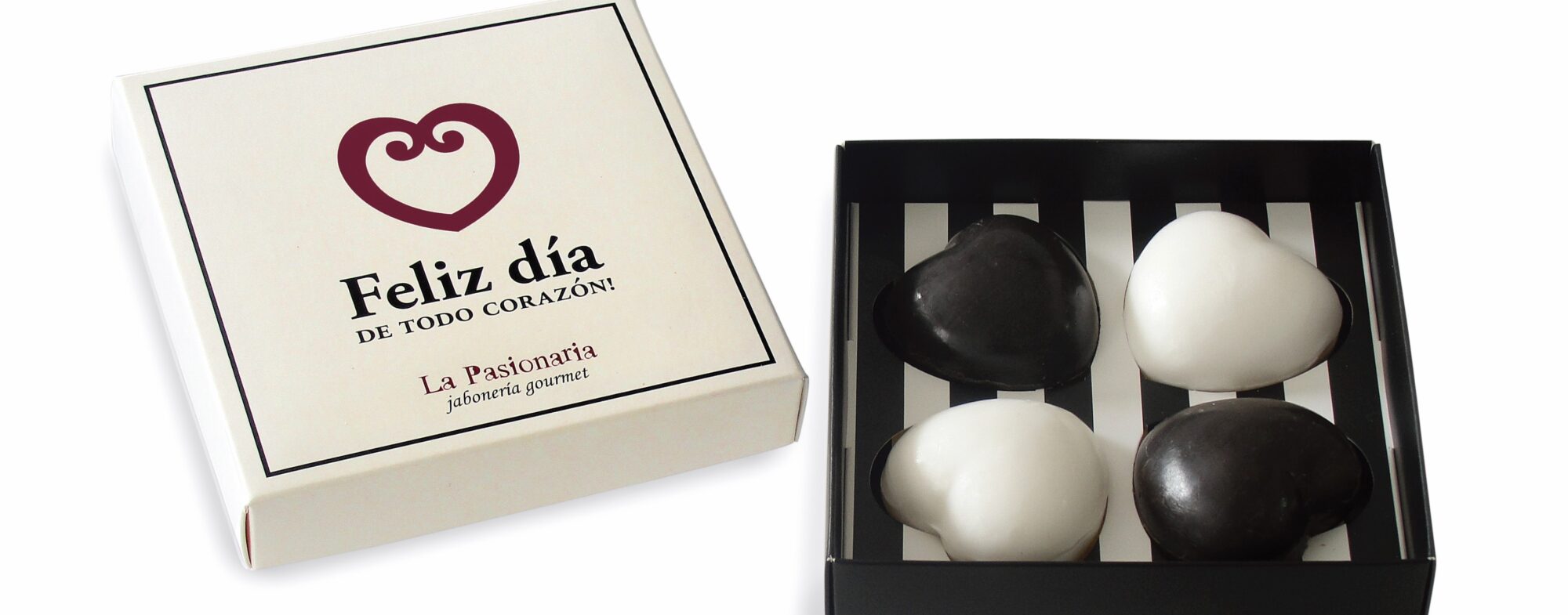 15% off en el estuche “¡Feliz día de todo corazón!”: Cuatro jabones en forma de corazón, con aroma a Coco y Chocolate, 100% vegetales y formulados con un alto porcentaje de aceites naturales que actúan como emolientes, nutriendo y suavizando la piel