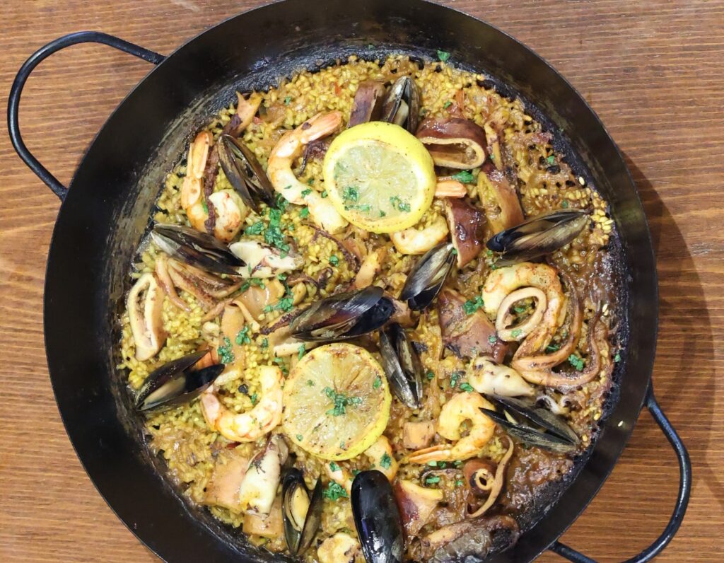y la tradicional paella de mariscos .
