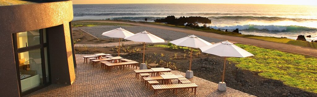 La arquitectura del hotel nace como un homenaje al poblado de Orongo, uno de los sitios más emblemáticos de la isla. Lejos de imponerse al paisaje, el diseño se integra de manera orgánica a través de formas curvas, techos verdes y el uso de materiales locales como piedra volcánica, madera y arcilla. Los espacios se articulan mediante senderos y jardines que replican la lógica de los antiguos asentamientos, generando una experiencia que conecta al huésped con el territorio desde lo espacial y lo simbólico.